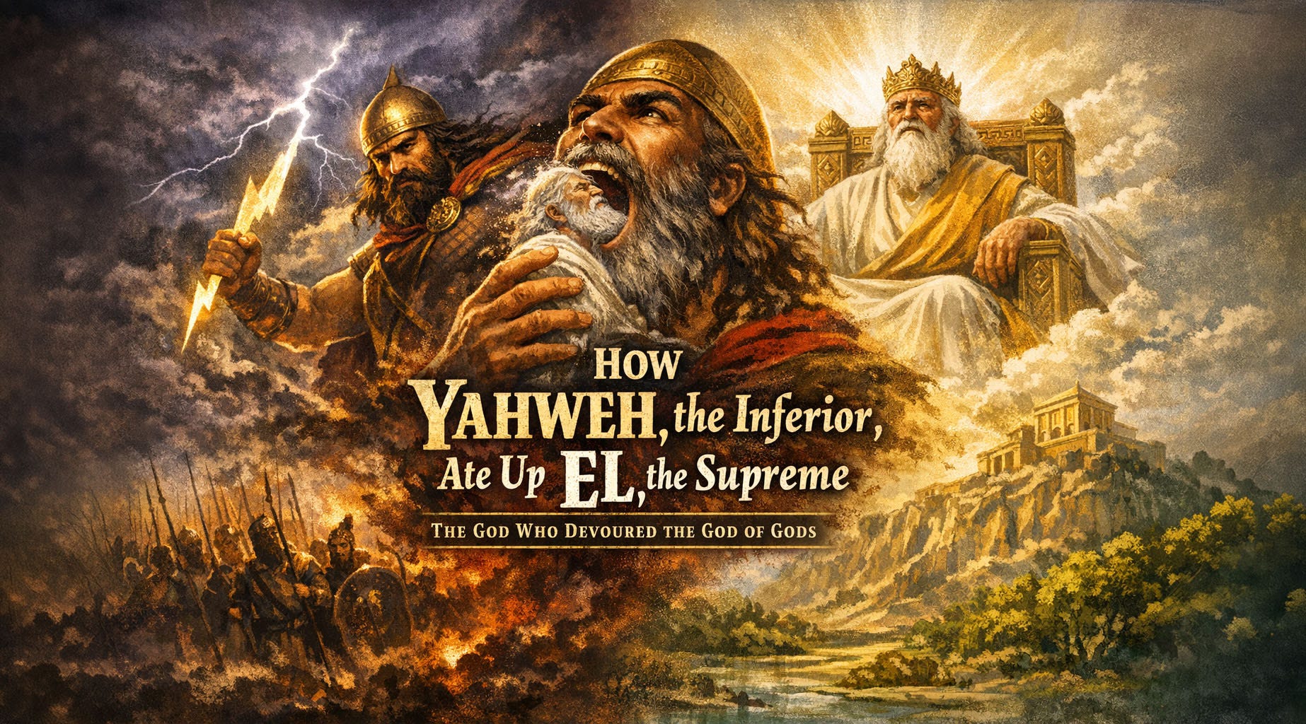 Before he became the god of Moses, before he became the sole deity of Judaism, Christianity, and Islam — before he became the creator of the universe, the judge of all nations, the one and only — Yahweh was a minor regional deity, a storm god from the southern deserts and a second-tier figure in a pantheon he didn’t run. As a god of war, he wasn’t gentle, either — a vicious god you didn’t question. You just obeyed and didn’t let your conscience get in the way.